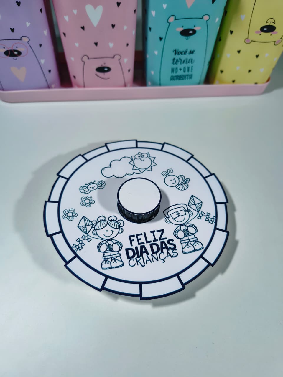 O arquivo vai em PDF (não editável), pronto para impressão, contendo 2 moldes na folha. As crianças podem soltar a criatividade pintando o pião do jeitinho que quiserem antes de montar.